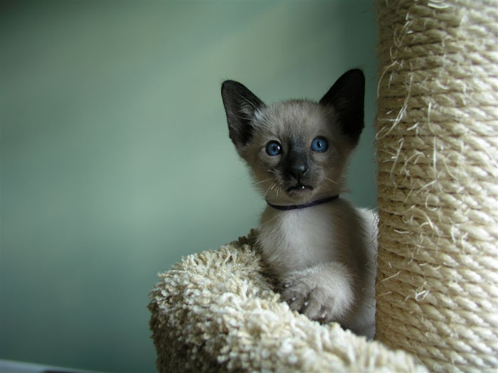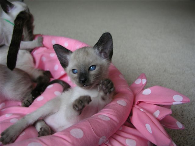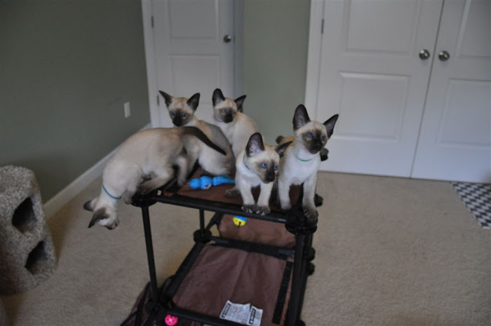 We have moved our babies from out of our bedroom down into our kitten room. Our older seal points have begun leaving for their new homes this past weekend ( http://ourfallbabies.blogspot.com/ )I have the new babies in a playpen in the kitten room for a day or two until they have adjusted to the move. The three older seal points (leaving next weekend)are enjoying the company of the babies. The kittens are very excited too, to have new playmates. I will take the playpen down in a day or two and the kittens will have the entire room to play in. After a day or two they will be allowed to explore our whole house.